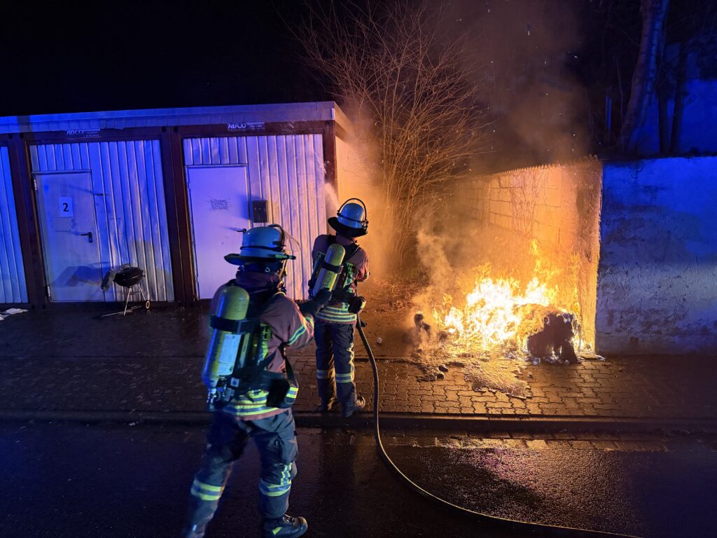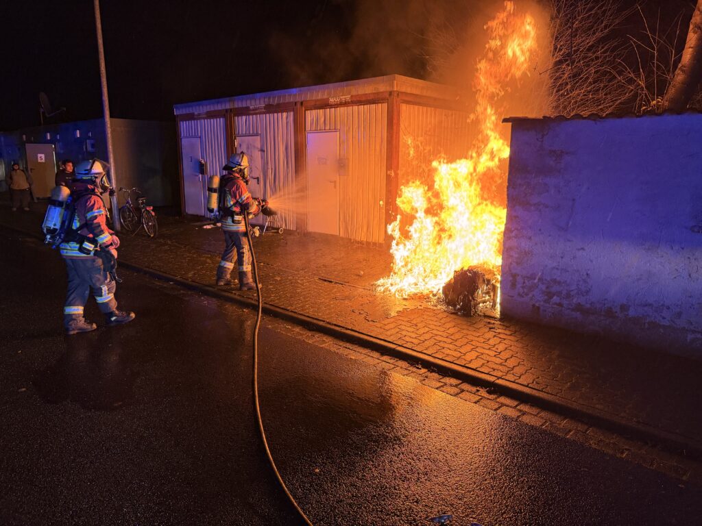 Ein Müllcontainer inkl. -unterstand brannte an den Sozialcontainern lichterloh. Wir löschten das Brandgut ab, schützten die naheliegenden Gebäude und Bäume und kontrollierten anschließend die Temperaturen mit der Wärmebildkamera.